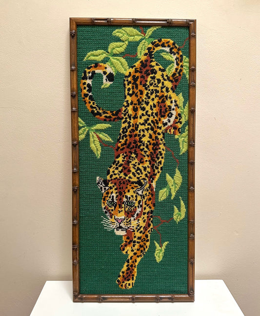 Vintage Leopard Needlepoint in Brown Bamboo Frame