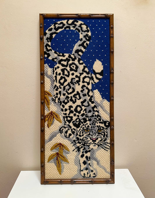 Vintage Snow Leopard Needlepoint in Brown Bamboo Frame