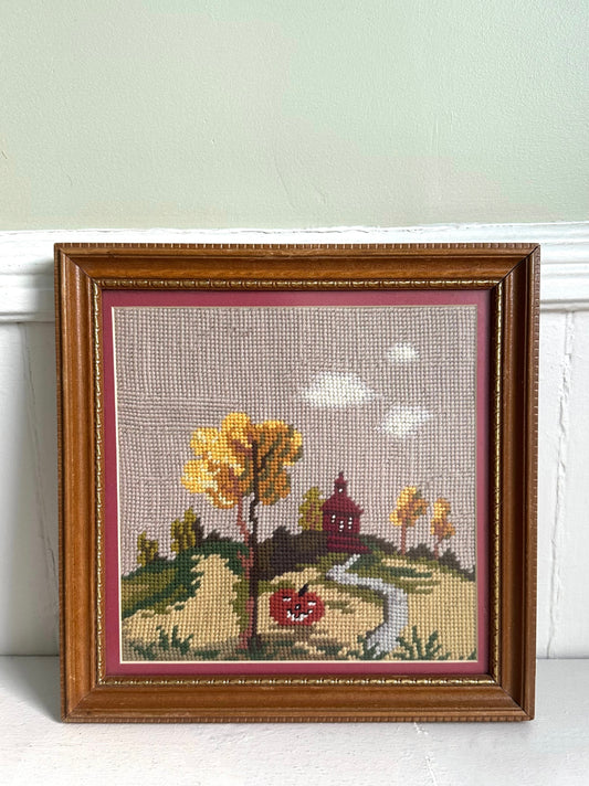 Vintage Pumpkin Fall Scene Framed Needlepoint