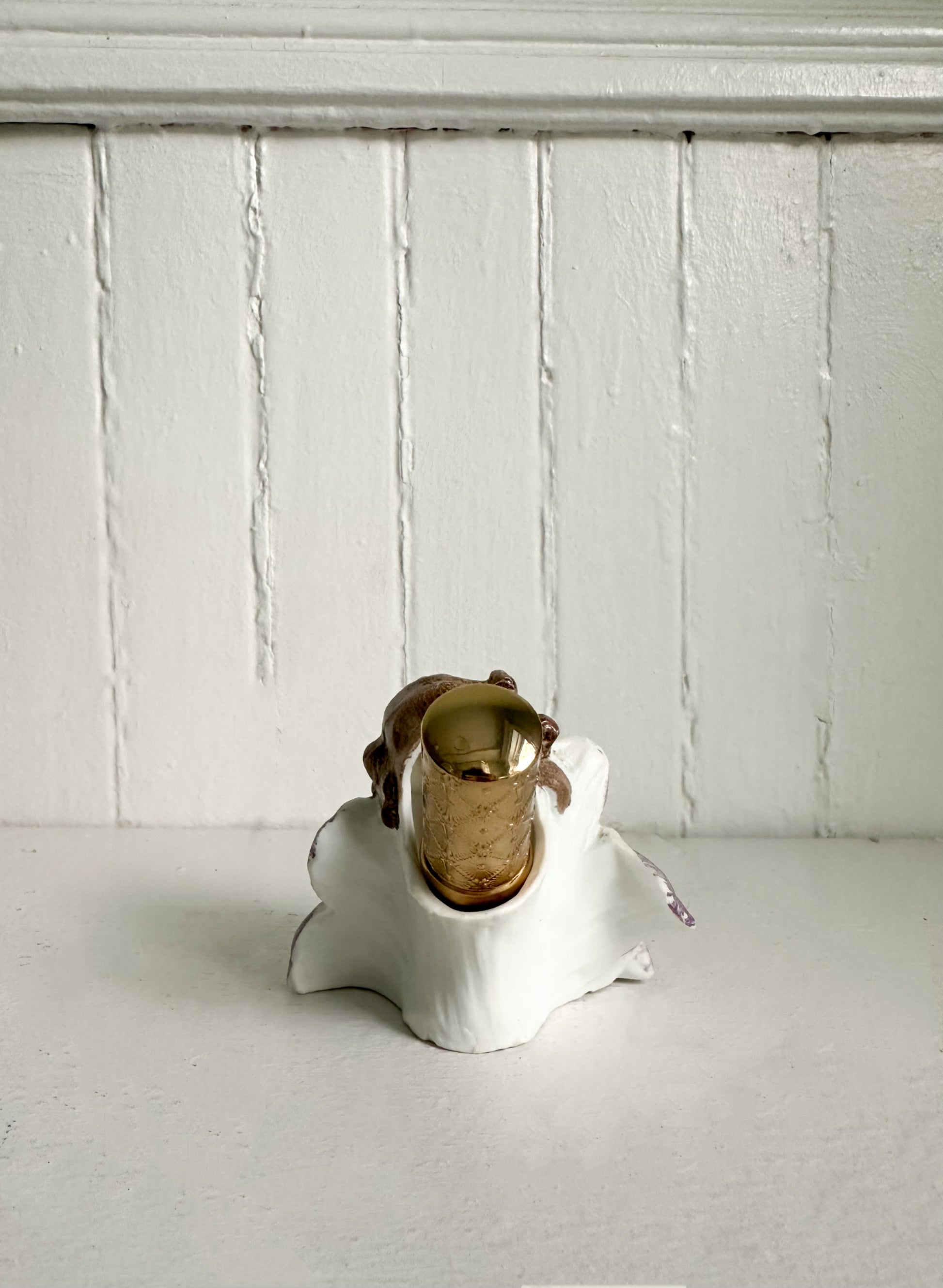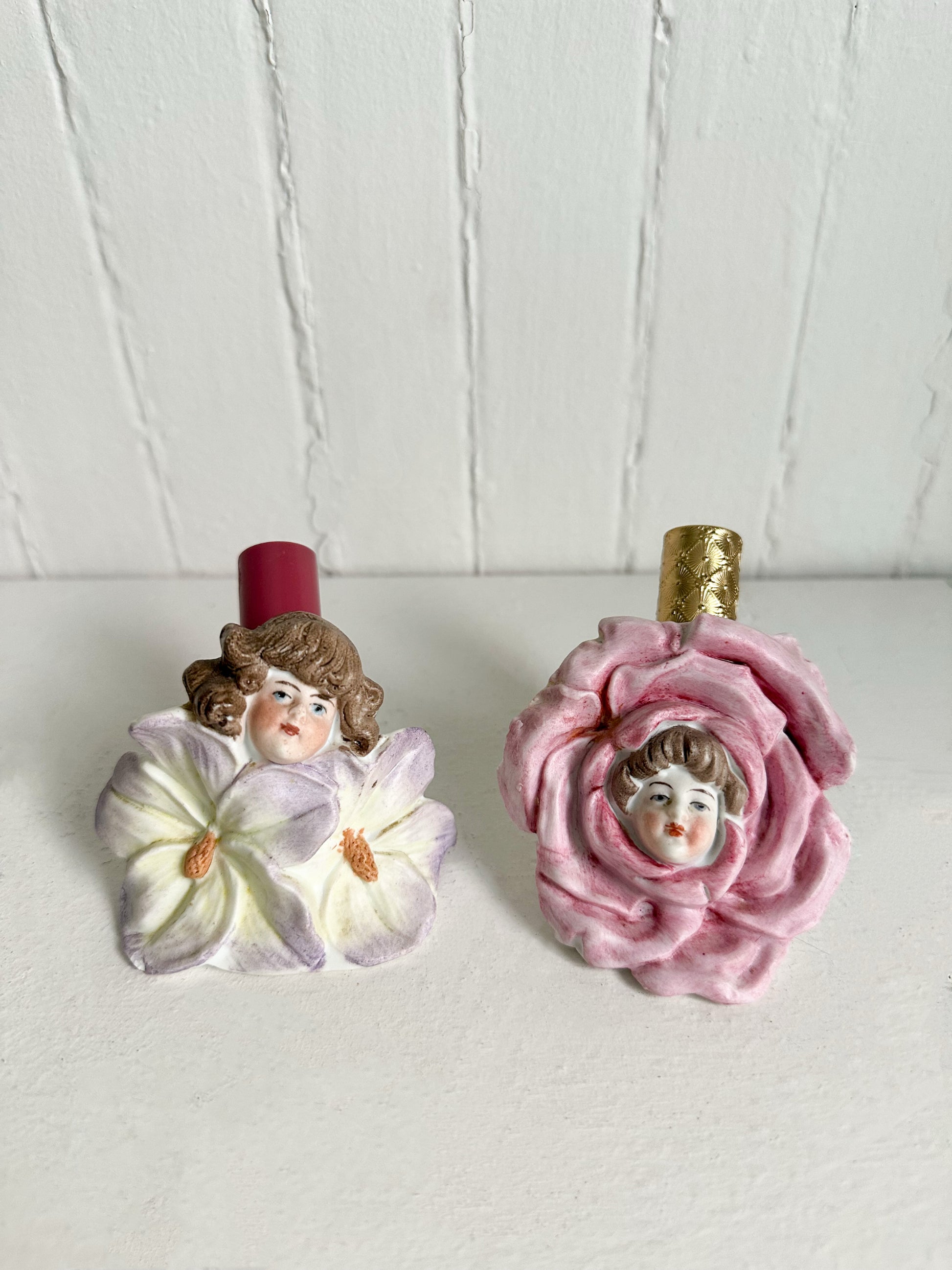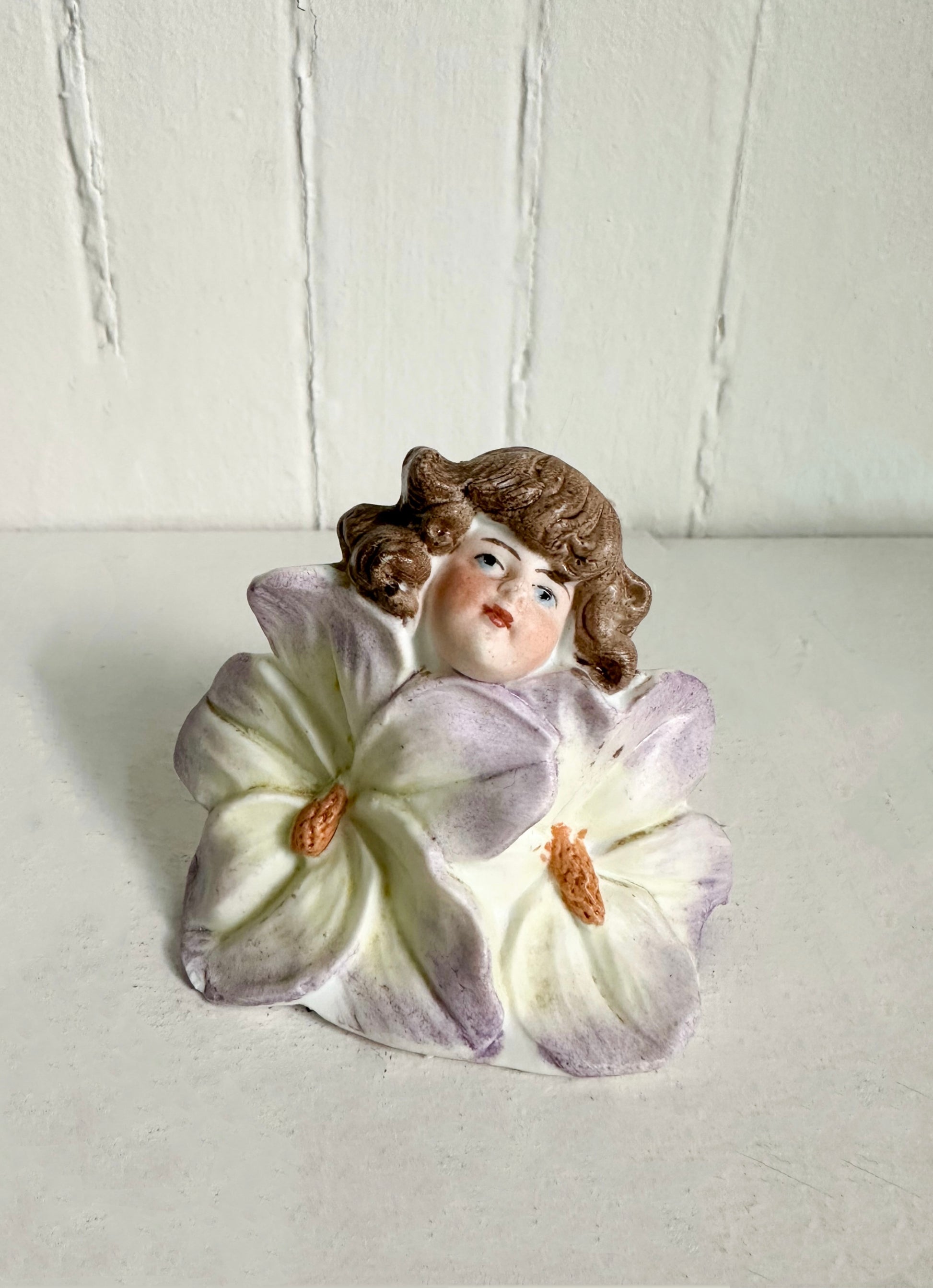 This exquisite and whimsical lipstick holder is a rare treasure. Crafted in porcelain, it features a delicately hand-painted face of a girl emerging from two pale lavender-tinted blossoms, capturing the romantic charm of early figural vanity pieces. The soft pastel petals and finely detailed facial features make this a unique find with both decorative and functional appeal.