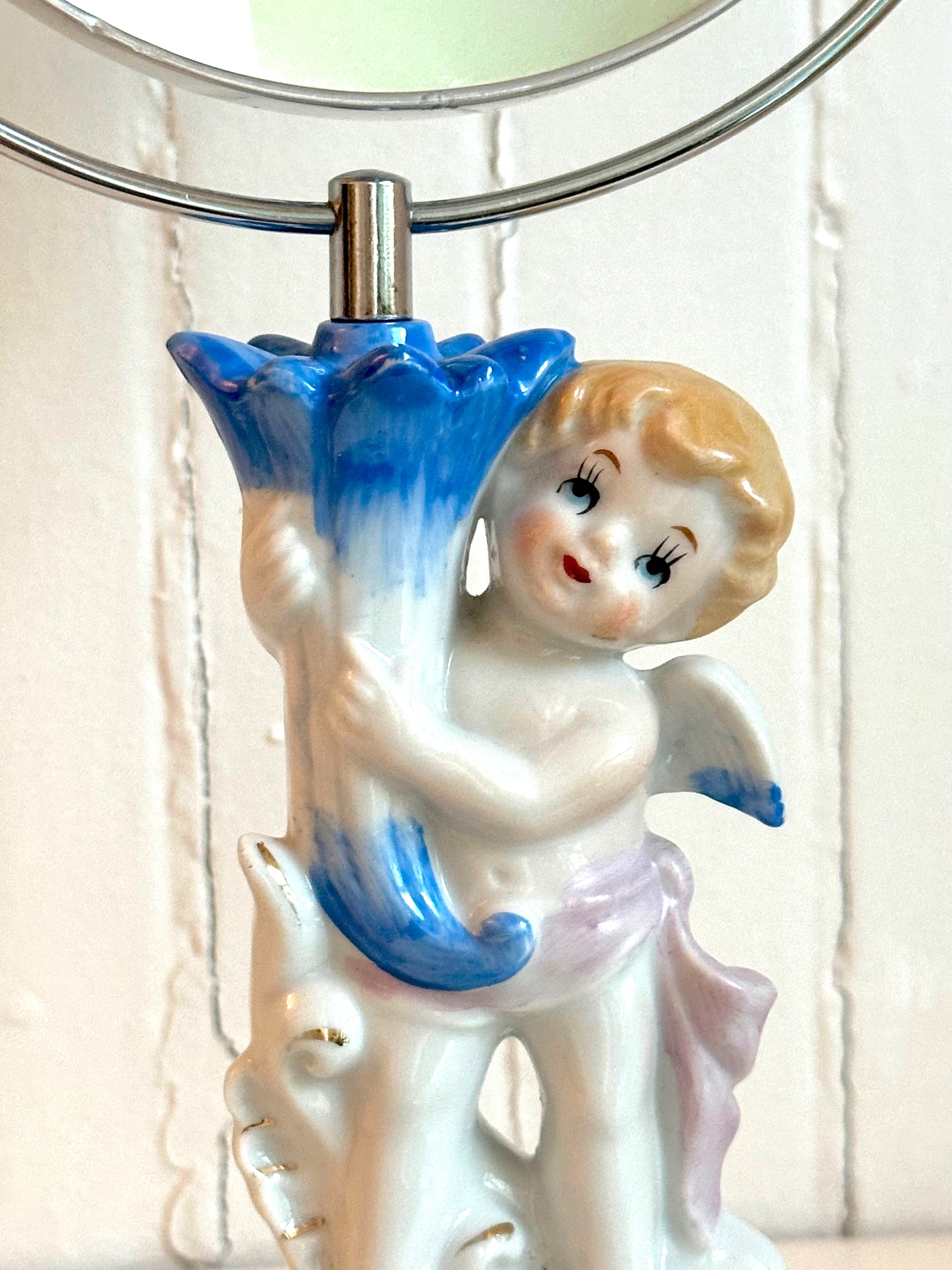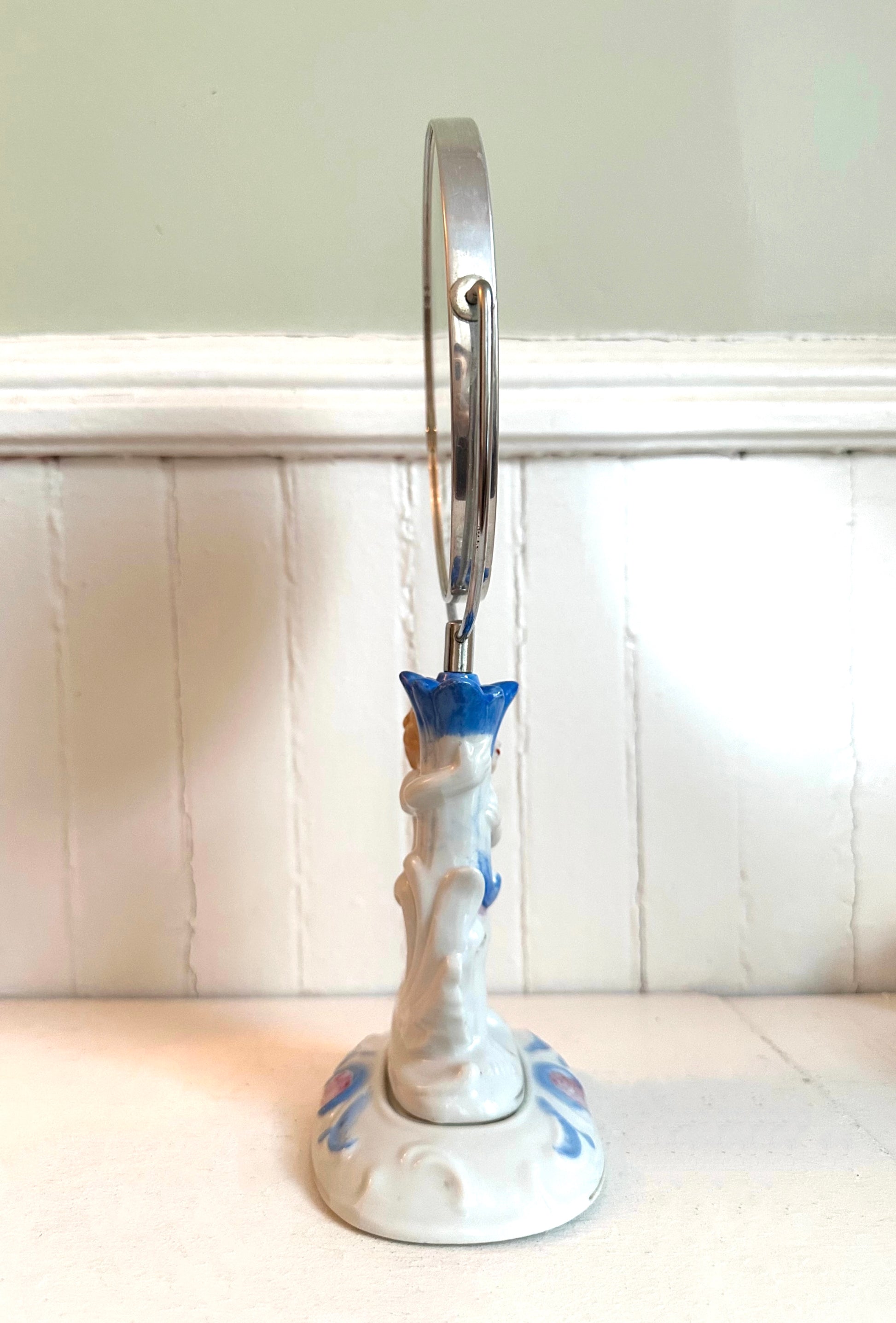 Double sided mirror. In very good condition. One side of mirror shows more wear than the other. The cherub is in excellent condition with vibrant colors. Please review all photos.