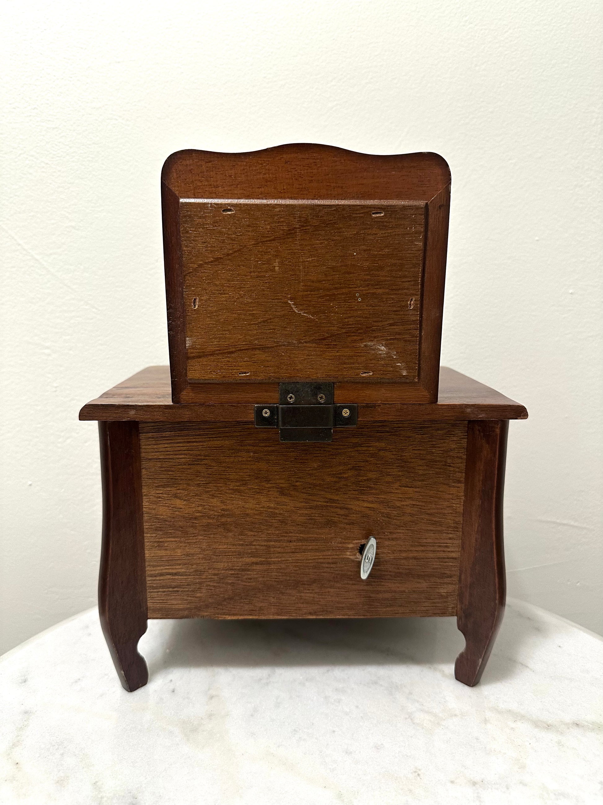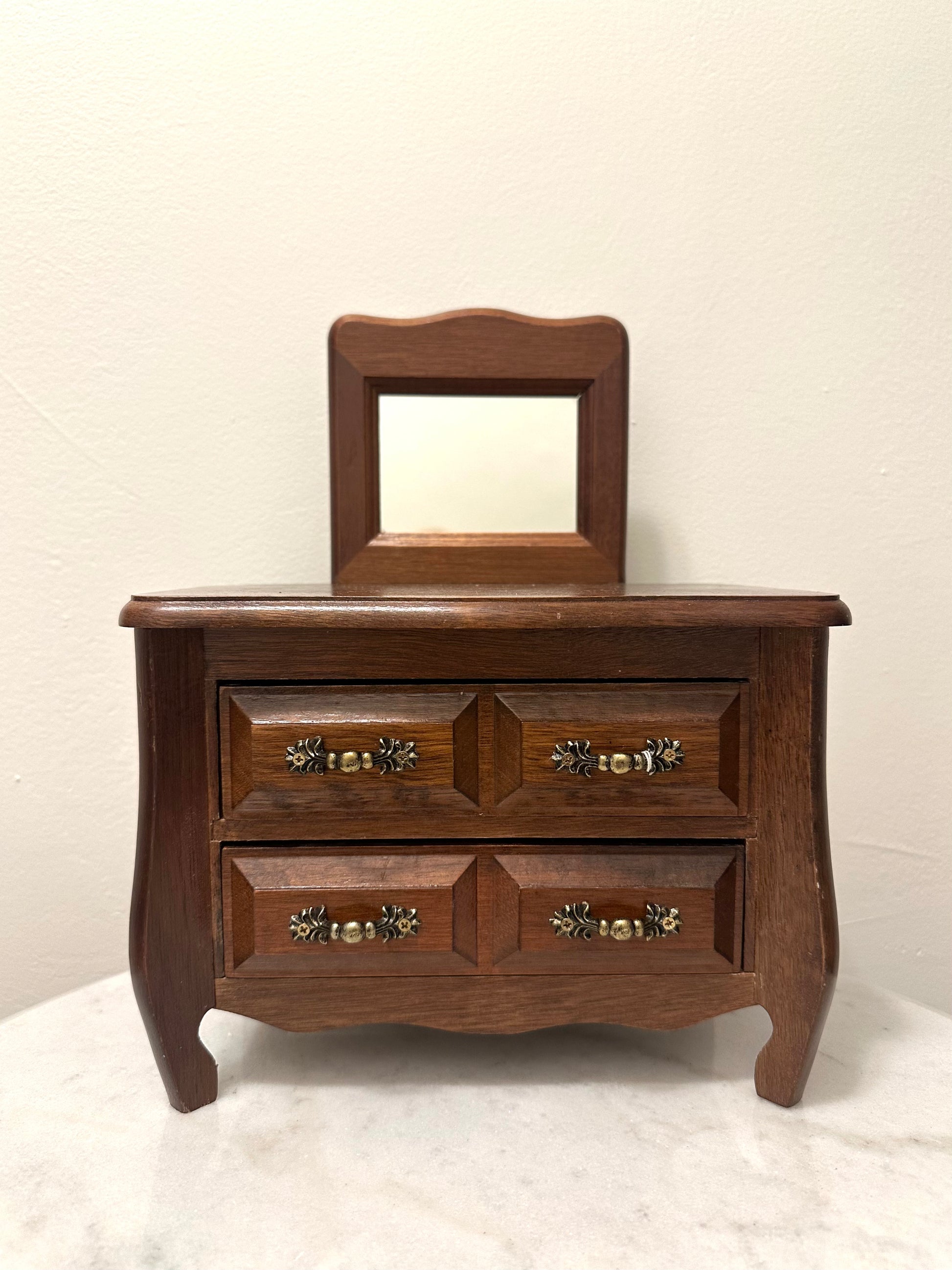 This sweet vintage jewelry box is designed to look just like a miniature dresser, complete with two pull-out drawers and ornate brass-style handles. Crafted from warm-toned wood, it features elegant curved legs and a removable mirror top.