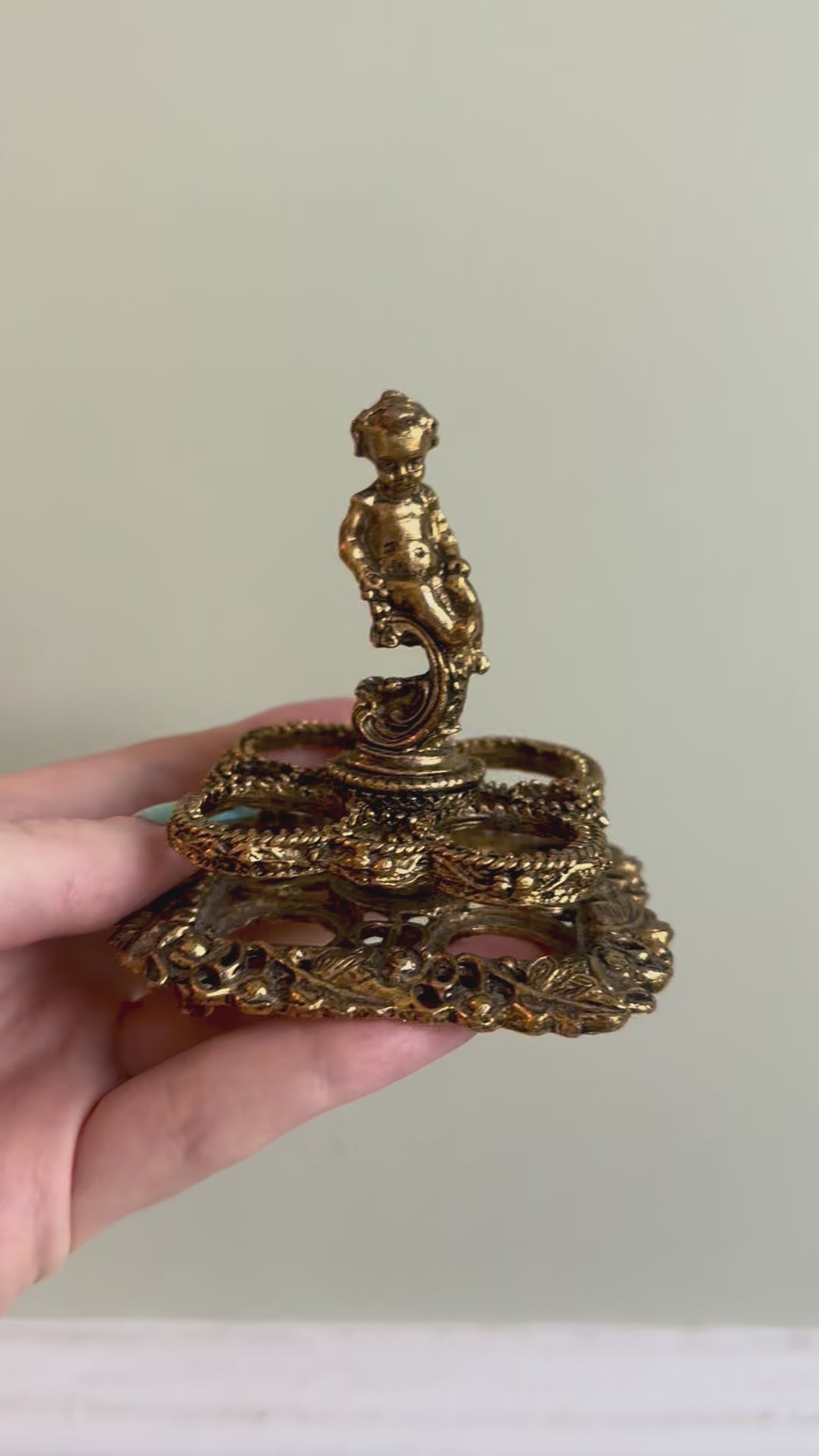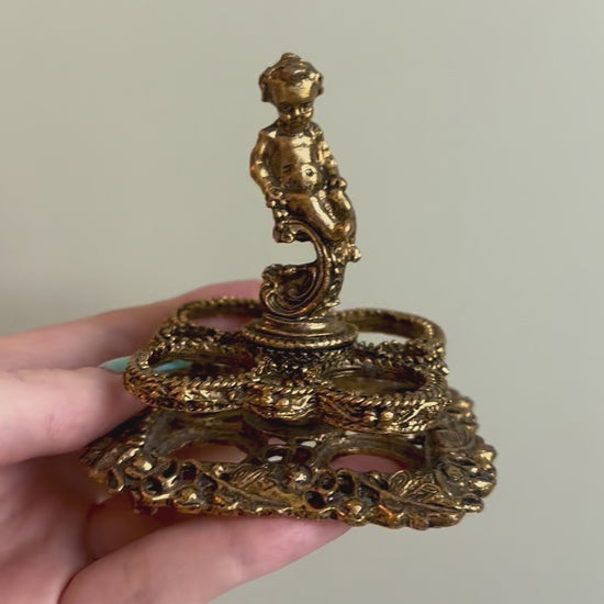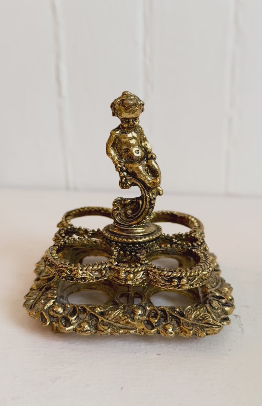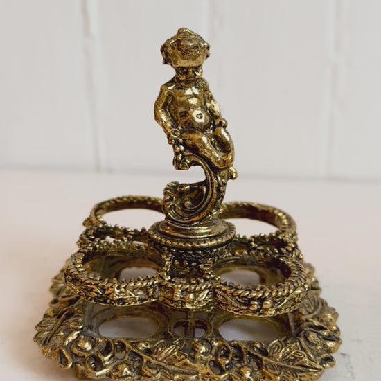 This ornate vintage lipstick holder is a striking blend of whimsy and elegance. Cast in gold-tone metal, it features a central cherub figure poised atop a swirling pedestal, surrounded by an intricate openwork base adorned with floral and leafy detailing. The design includes four circular slots, perfect for displaying and organizing your favorite lipsticks. With its rich patina and baroque-inspired charm, this piece makes a unique and functional statement for any vintage lovers vanity.