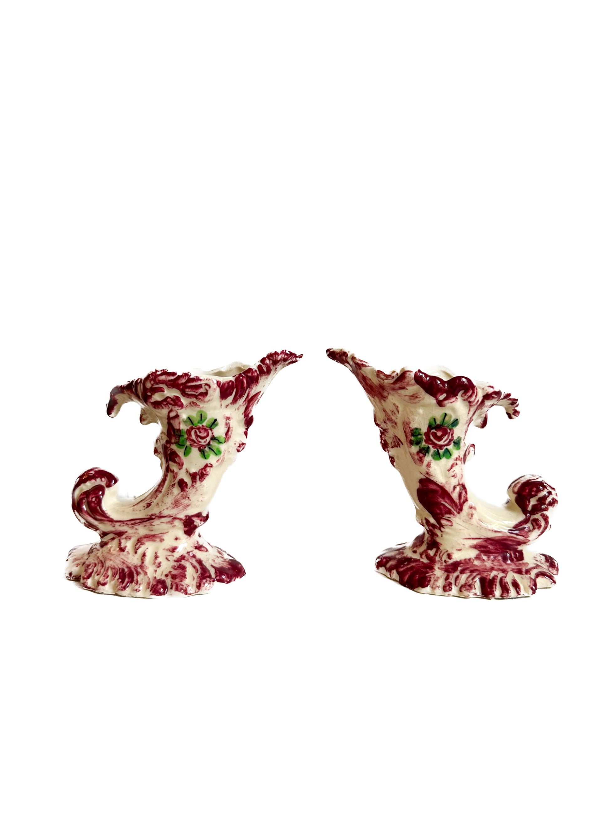 Vintage Mini Floral Vases ~ Pair of two vintage ceramic vases in a rich burgundy and cream color palette, accented with hand-painted roses and green leaves. Each vase features a dramatic scroll form with textured detailing and a glossy glaze finish. Dating from the mid-20th century, this duo offers a bold decorative statement, perfect for displaying small floral arrangements or as standalone stylish accent pieces.