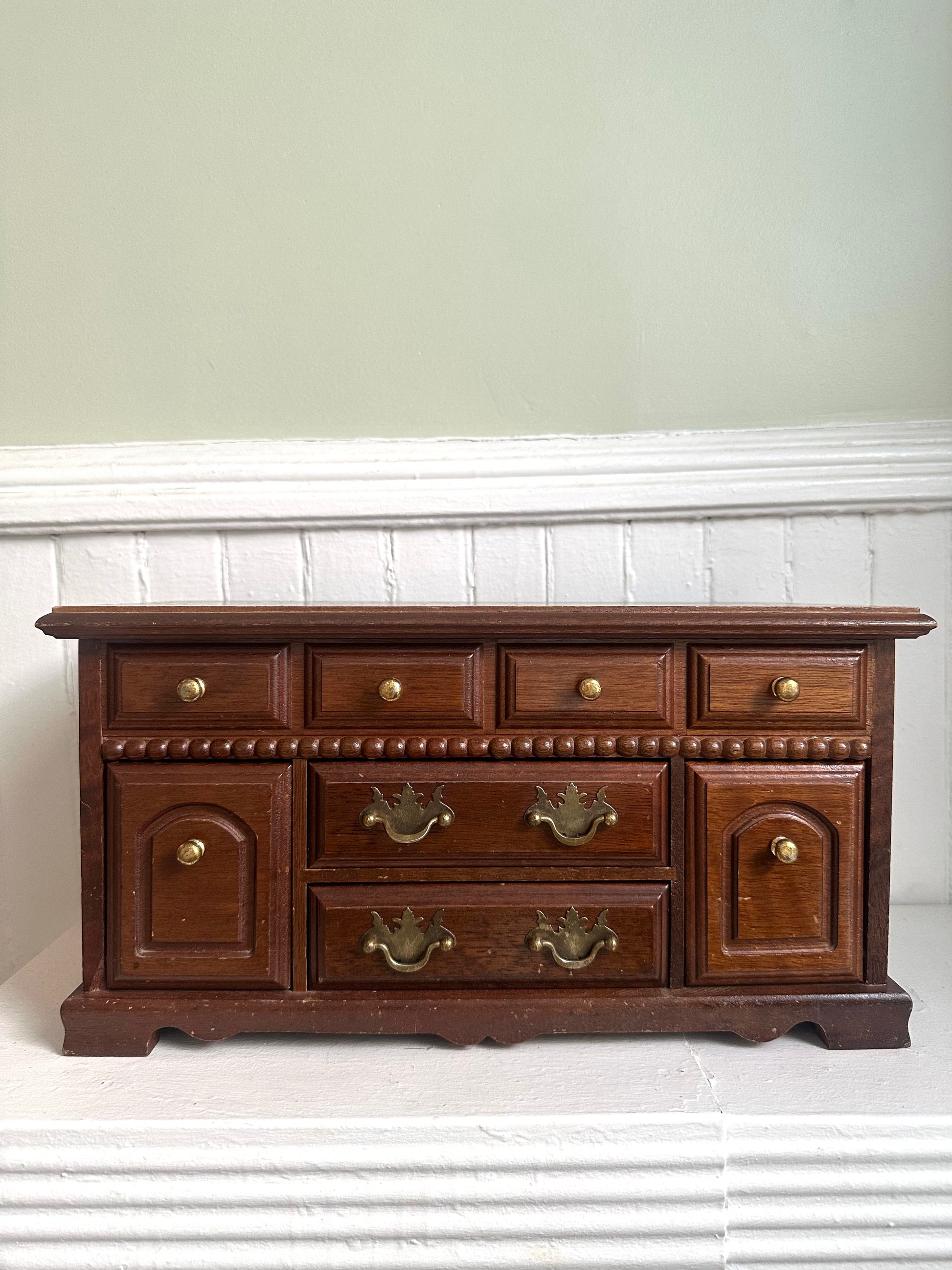 This rare vintage jewelry box looks like a miniature dresser, complete with brass hardware and a rich wood finish. The hinged lid opens to reveal a mirrored top compartment with multiple velvet-lined sections, perfect for storing rings, earrings, and delicate keepsakes. Below, two pull-out drawers and side compartments offer generous space for all of your favorite rings.