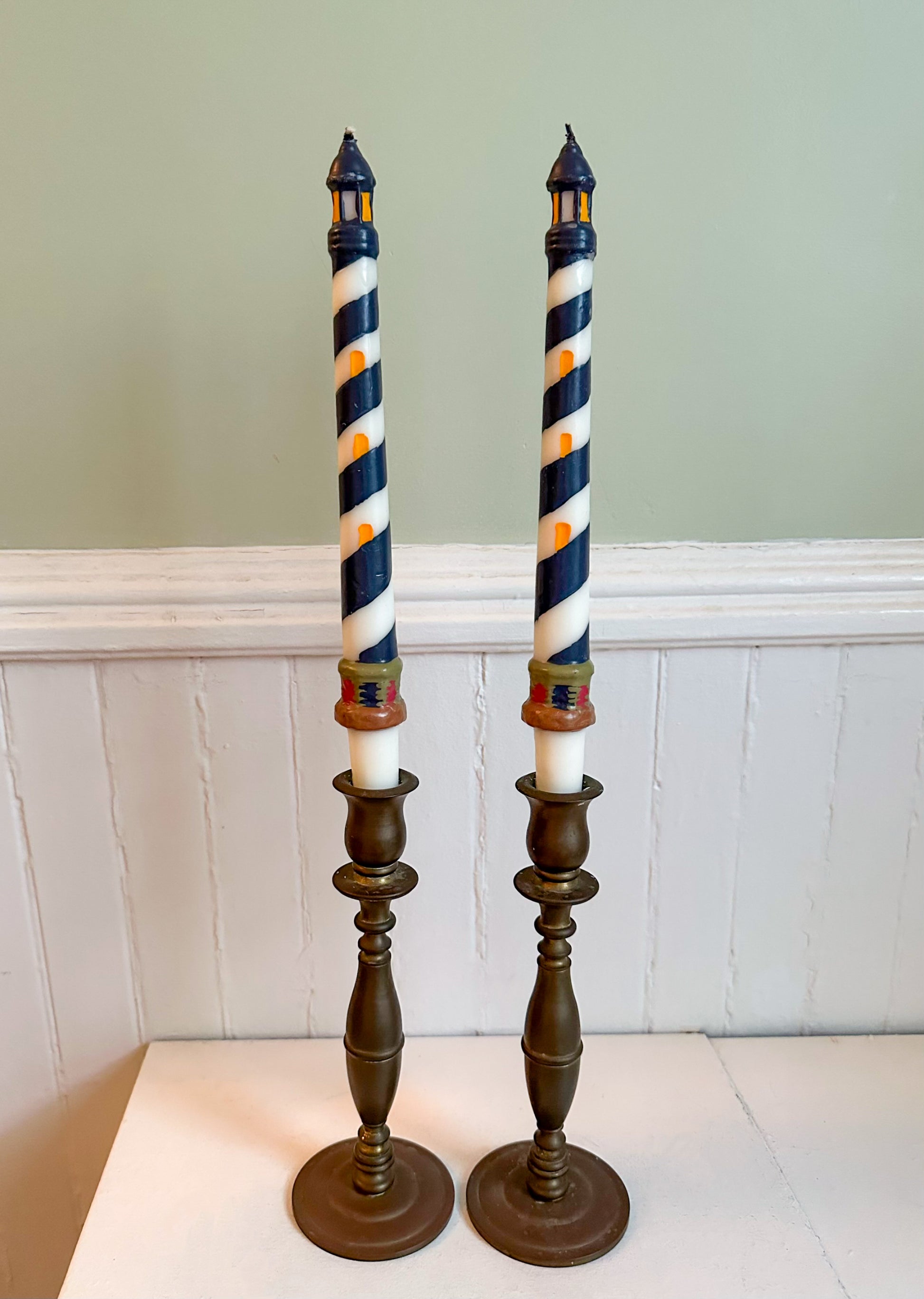 Add some soft coastal vibes to your home with this pair of vintage lighthouse taper candles. Featuring bold navy and white spiral stripes and a charming lighthouse lantern top, these candles are as decorative as they are nostalgic and sweet. Perfect for nautical-themed décor, seaside cottages, or collectors of unique vintage candles, they’re an eye-catching addition whether displayed or lit.