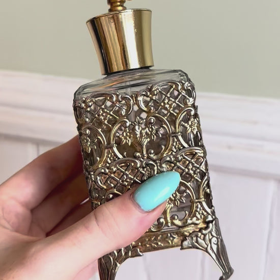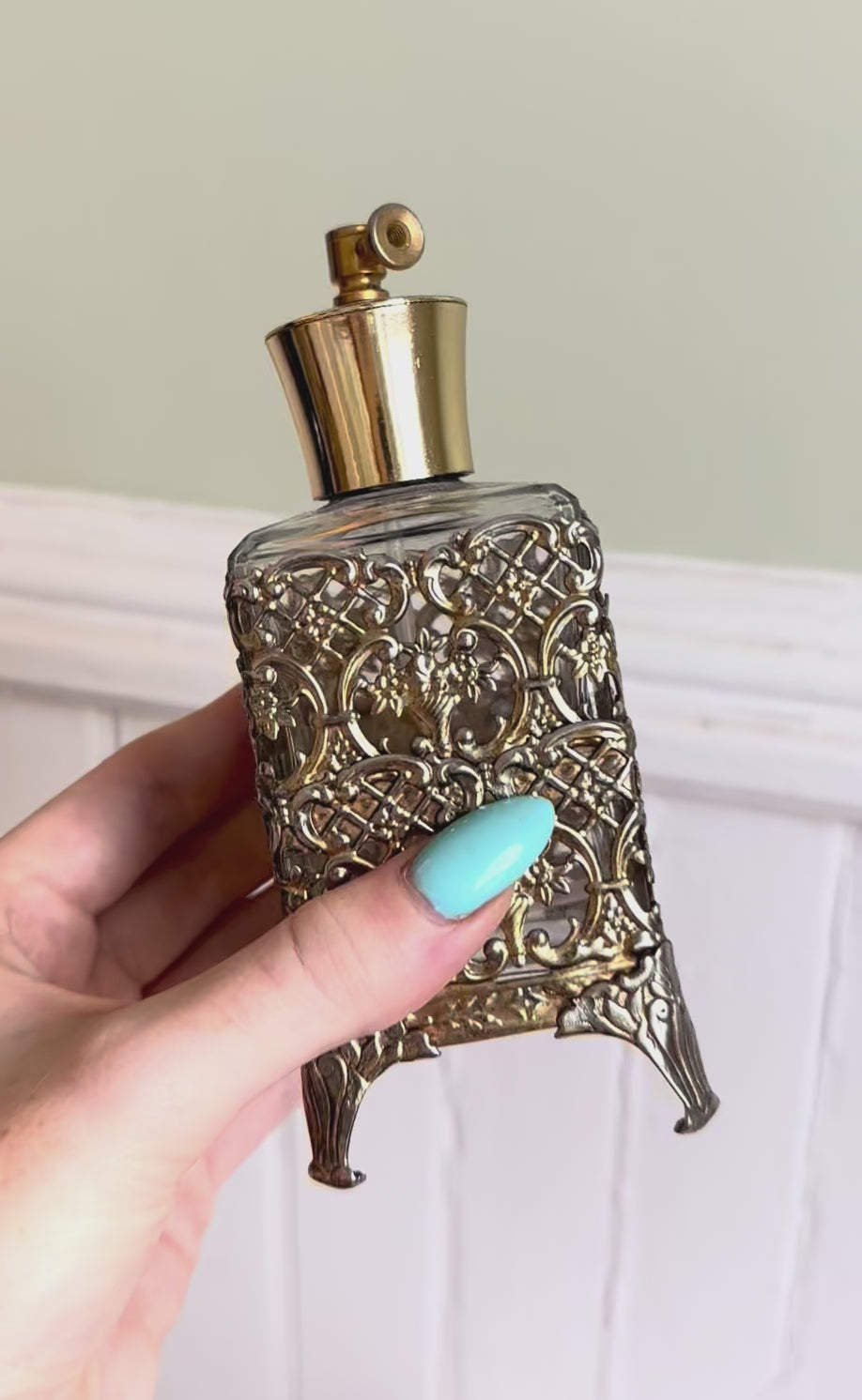 This elegant vintage perfume bottle combines delicate glass with an intricately crafted brass filigree cage. The clear glass body is encased in a lattice of scrolling floral designs, giving it a luxurious, old-world appeal. Resting on four decorative feet and topped with a gleaming gold-tone sprayer, this piece was designed to bring both beauty and functionality to a vanity table. Perfect to hold your favorite perfume, or stand alongside them to for an eye catching vanity display.