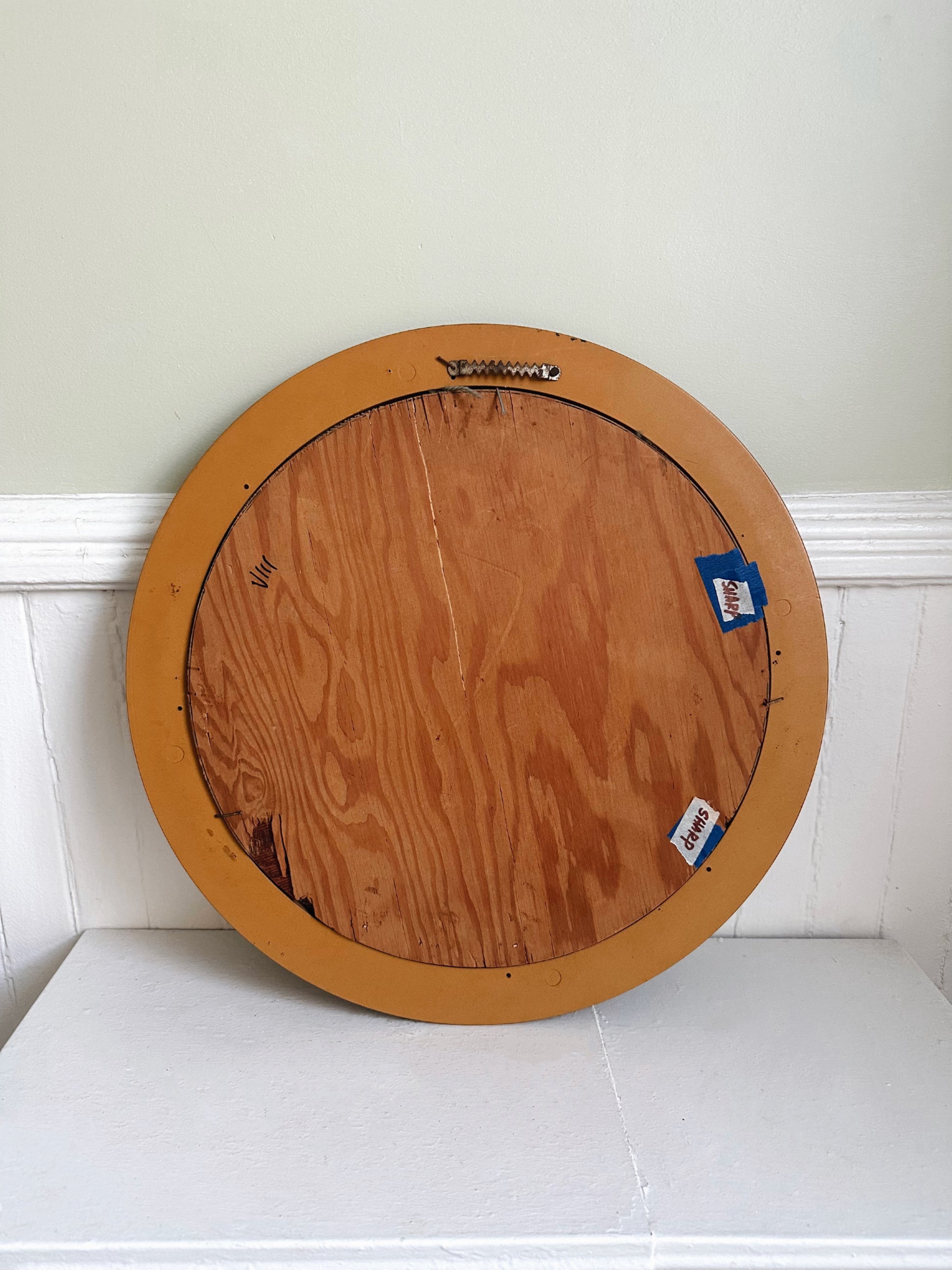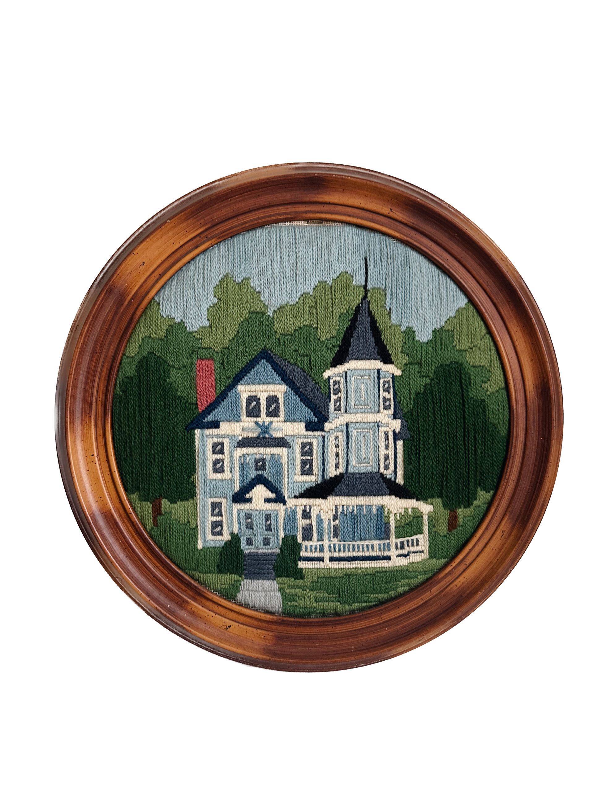 This beautiful vintage needlepoint features a Victorian house framed by lush greenery, all set within a warm round wooden frame. With its charming details and storybook style, the scene feels straight out of Practical Magic, perfect for capturing that cozy, magical witches’ house vibe.